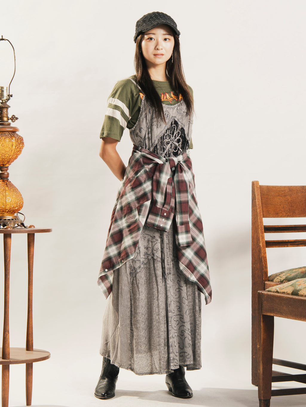 インド製のレーヨン刺繍生地で仕立てたキャミワンピ。細かな刺繍モチーフや表面のウォッシュ加工など、エスニックなデザインが魅力的な一着です。胸元にはベロアをあしらい上品な雰囲気に。サイドにファスナーが付いています。