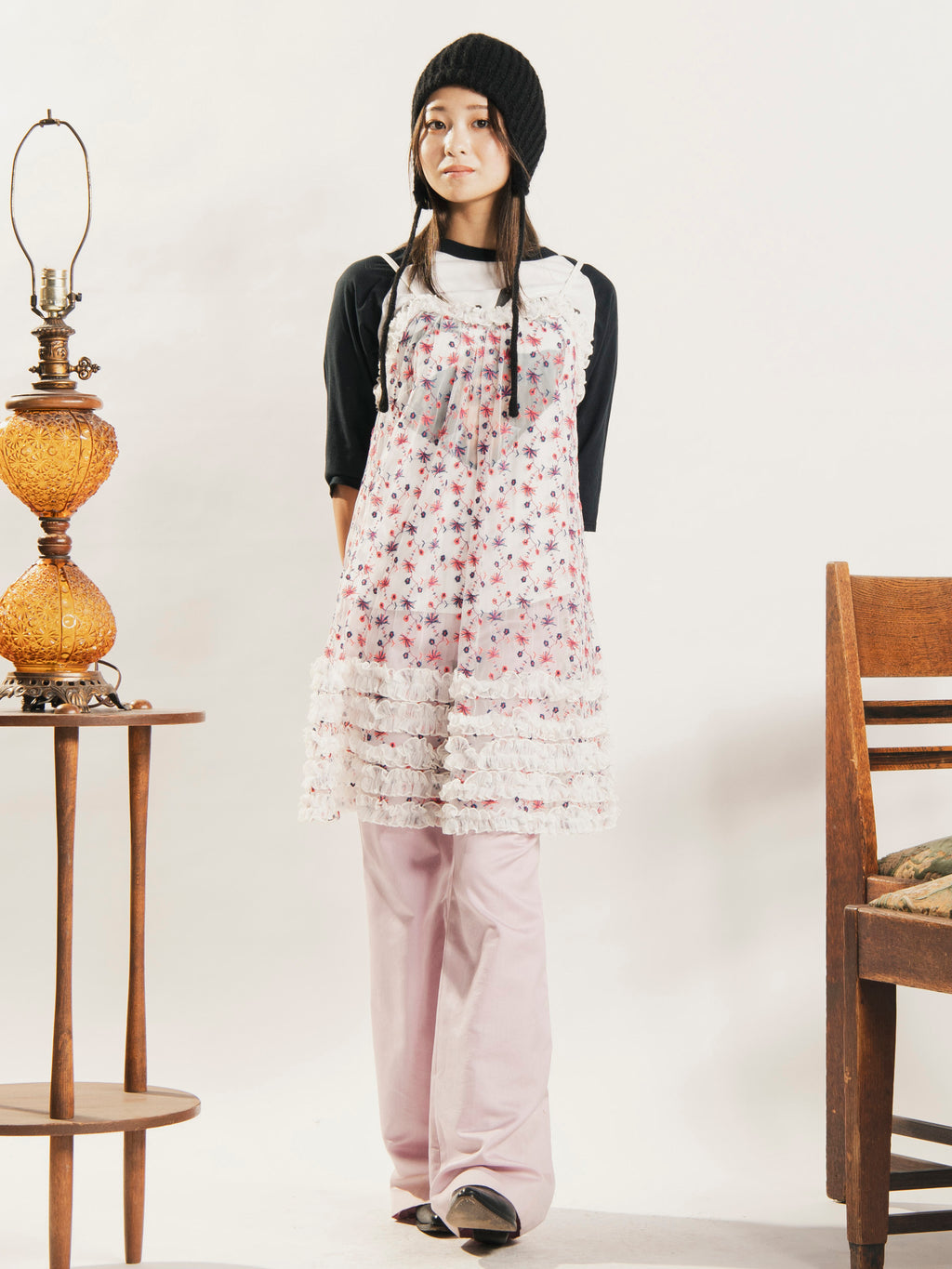 チュール生地にお花の刺繍とフリルをあしらったキャミワンピ。リラクシーなシルエットで、ランジェリーのようなデザインが可愛らしい一着です。絶妙なミニ丈とチュールの透け感でレイヤードコーデを楽しめます。