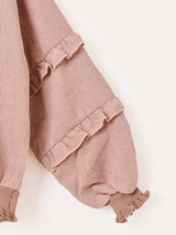くすみカラーとフリルをあしらったガーリーなデザインが魅力的な長袖のコーデュロイトップス。ネックと袖口のメロウリブがポイント。程よい厚みの柔らかな生地です。
