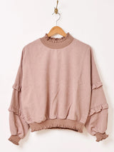 くすみカラーとフリルをあしらったガーリーなデザインが魅力的な長袖のコーデュロイトップス。ネックと袖口のメロウリブがポイント。程よい厚みの柔らかな生地です。