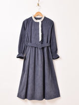 首元のプリーツフリルがカジュアルなコーデュロイに上品さを添える長袖ワンピース。共布のベルトは他のスタイリングでも活躍してくれそうです。程よい厚みであたたかみ溢れる一着。
