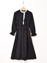 首元のプリーツフリルがカジュアルなコーデュロイに上品さを添える長袖ワンピース。共布のベルトは他のスタイリングでも活躍してくれそうです。程よい厚みであたたかみ溢れる一着。