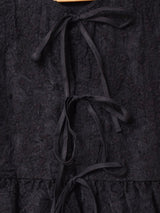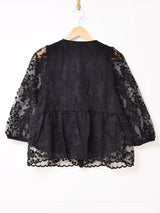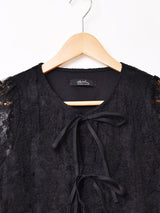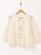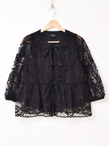 全体に施された花の刺繍や、フロントのリボン留めがガーリーな印象のチュールブラウス。裏地付きですが腕周りや裾は透け感があります。