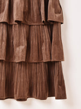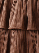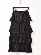 4段のラッフルデザインがポイントになった、プリーツ状のロングスカート。ややタイトめの綺麗なシルエットで着こなしていただけます。ウエストゴム仕様で着脱が楽ちんです。
