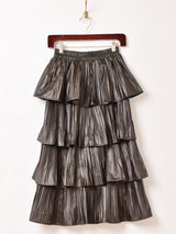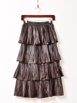4段のラッフルデザインがポイントになったロングスカート。プリーツ加工されたフェイクレザー生地で、軽やかな質感です。ややタイトめの綺麗なシルエットで着こなしていただけます。