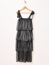 きらりと光るラメ加工が施されたキャミワンピ。肩紐を結べるのでお好みの丈に調節可能。ゆらゆらと揺れるラッフルデザインも魅力的な一着です。