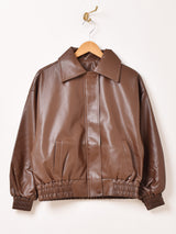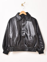 フェイクレザーの艶と滑らかな質感が目を惹くブルゾンジャケット。裾と袖口はリブ仕様なので風を通さず防寒にも◎。ポリエステル素材100%の裏地付きです。