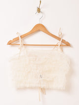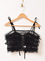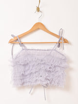 華やかなフリルデザインが目を惹くチュール生地のビスチェ。肩紐は結ぶタイプでフロントはリボン留めになっており、前後でどちらとも着られる2Way仕様。程よい透け感が、レイヤードを楽しめる一着です。