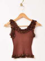 レース生地のフリルがふんだんにあしらわれ、一枚で着てもインナーとして着てもアクセントになる一点。伸縮性があり身体にフィットしてくれます。