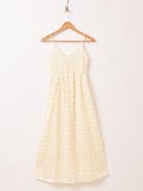 ジグザグ模様のフリンジがあしらわれたキャミワンピ。デコルテのVラインで顔周りをスッキリと見せて、メリハリのあるスタイルに仕上げてくれます。バックはギャザー仕様、安心の裏地付きです。