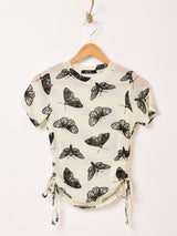 蝶のモチーフがフロッキープリントされた、メッシュ生地のカットソー。サイドのギャザーで長さが調節でき、スタイルアップ効果も期待できそう。全体にラメが施されており、角度によって表情が違って見えるところもポイントです。程よい透け感があり、伸縮性もあります。