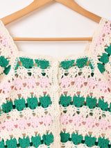 カラフルなカギ編みにパフスリーブが夏らしいアイテム。着丈が短めでコーディネートのバランスを取りやすく、前を閉めてトップスとしても、ワンピースにレイヤードしても可愛く着こなせます。