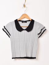 袖周りのフリルデザインとガーリーな襟が可愛らしいサマーニットトップス。ショート丈でぴったりとしたサイズ感なのでフェミニンな着こなしに。伸縮性のある生地感です。