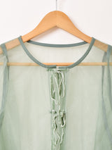 ふんわりとしたバルーンスリーブに、ウエストを絞ったペプラムデザインが可愛らしいリボン留めのブラウス。リボン部分はベロア生地になっていて、より上品な印象に。シアーの大胆な透け感がレイヤードスタイルに活躍すること間違いなしの一着です。