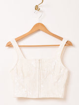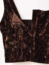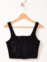 ベロア生地にシワ加工が施され、ランダムな光沢感が出てカジュアルな印象のビスチェ。通常のベロア生地に比べて伸縮性があるので、体にフィットしてくれます。前はホックで留められる仕様です。