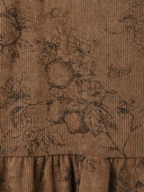 細畝のコーデュロイ生地に、草花のモチーフがプリントされたスリーブレスワンピース。ウエスト部分にはギャザーが入っており、程よくスタイルアップ効果が期待できそう。ベルト紐付きです。