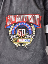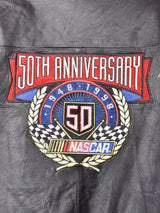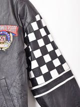 アメリカ最大のモータースポーツ団体、ナスカーの50周年記念レーシングジャケット。両袖のチェッカーやバックデザインが存在感抜群。ジェフハミルトンのボディを使用した、重量感のあるタフな一点です。