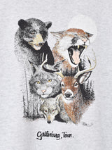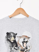 クマやオオカミ、シカなど森の動物たちが大集合したプリントが目を惹くスウェットシャツ。フルーツオブザルームのボディで程よい厚みがあります。
