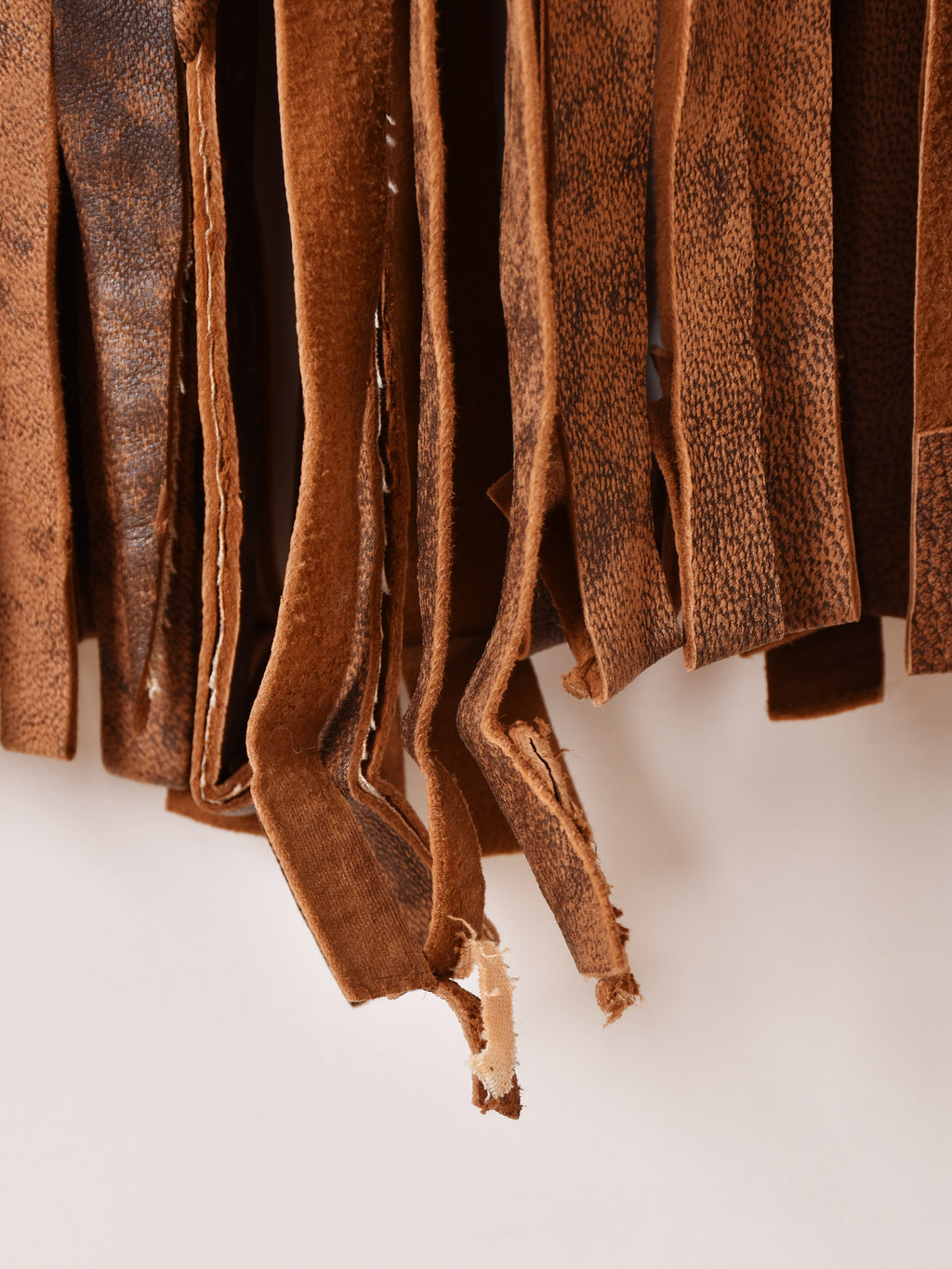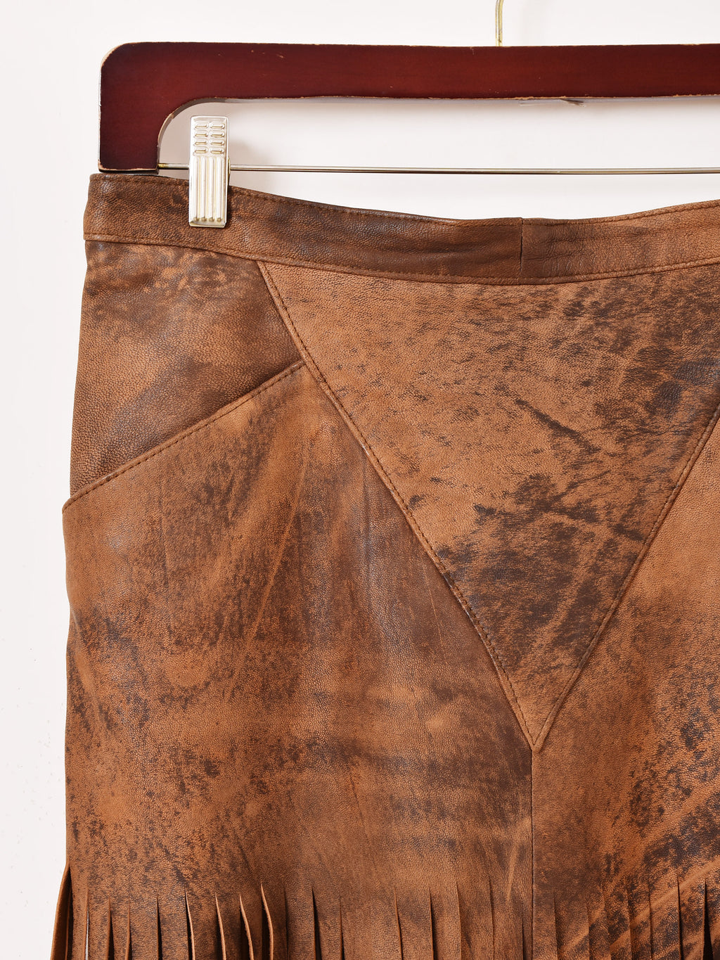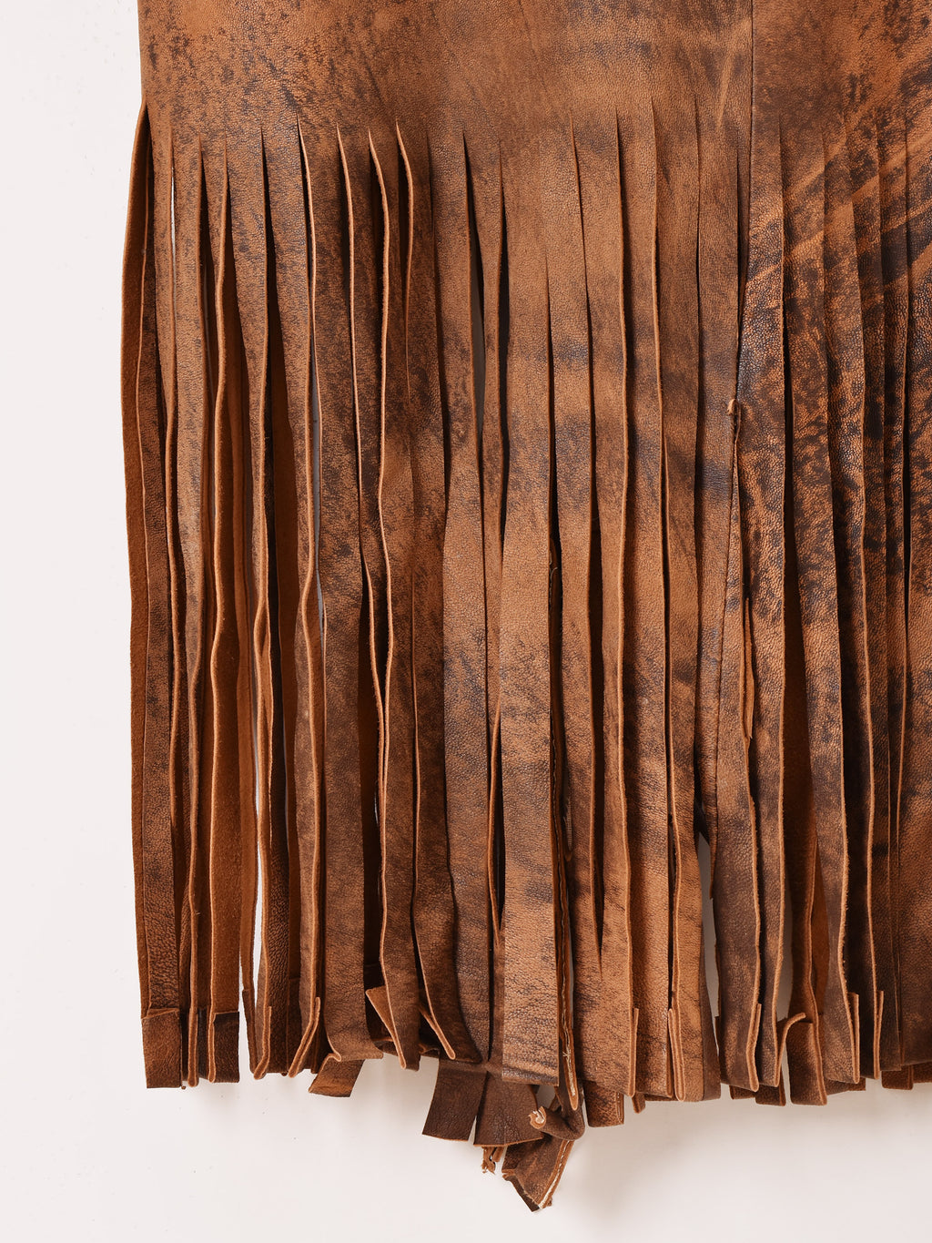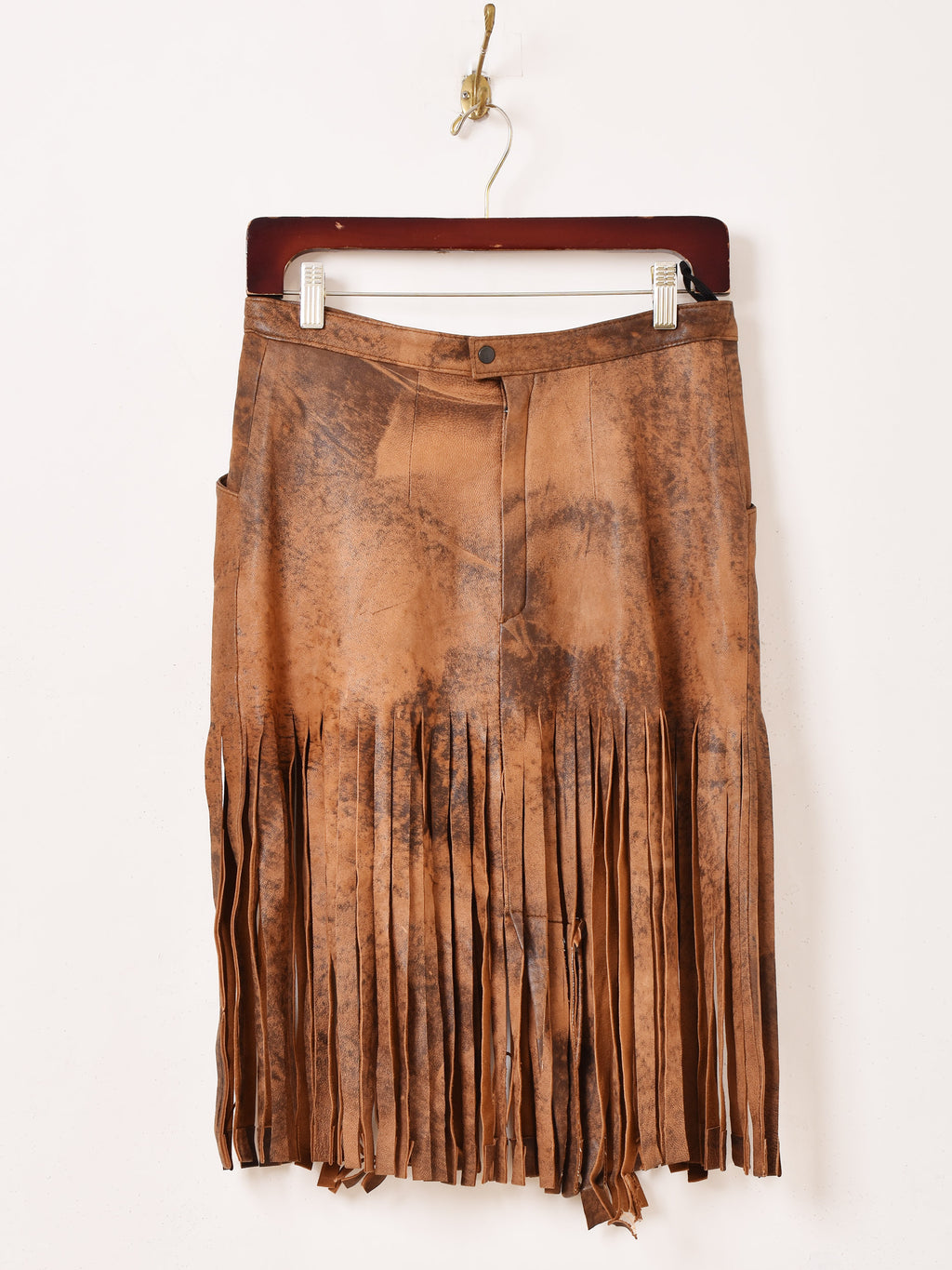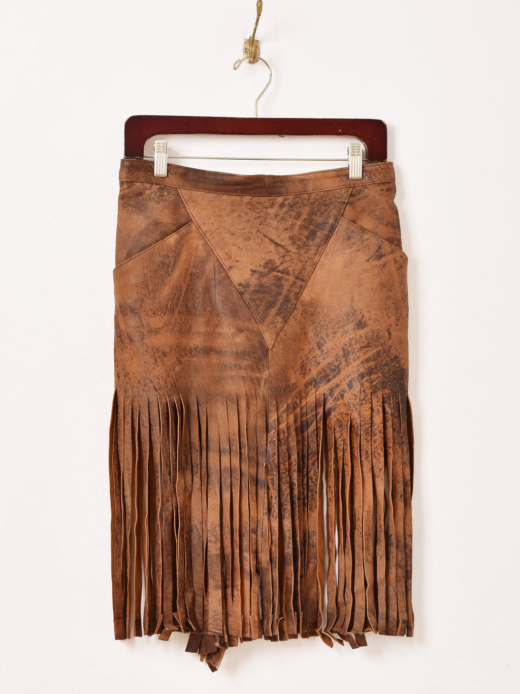 フリンジ加工を施したレザースカート。レイヤードアイテムとして、他のボトムスと組み合わせてコーディネートしても可愛いく着こなせます。アレンジも効き、主役にもなれる一着です。