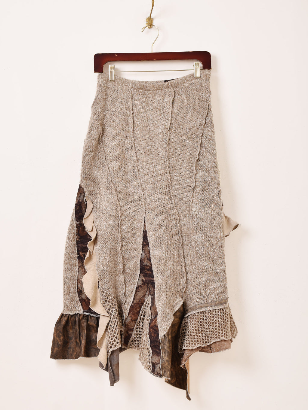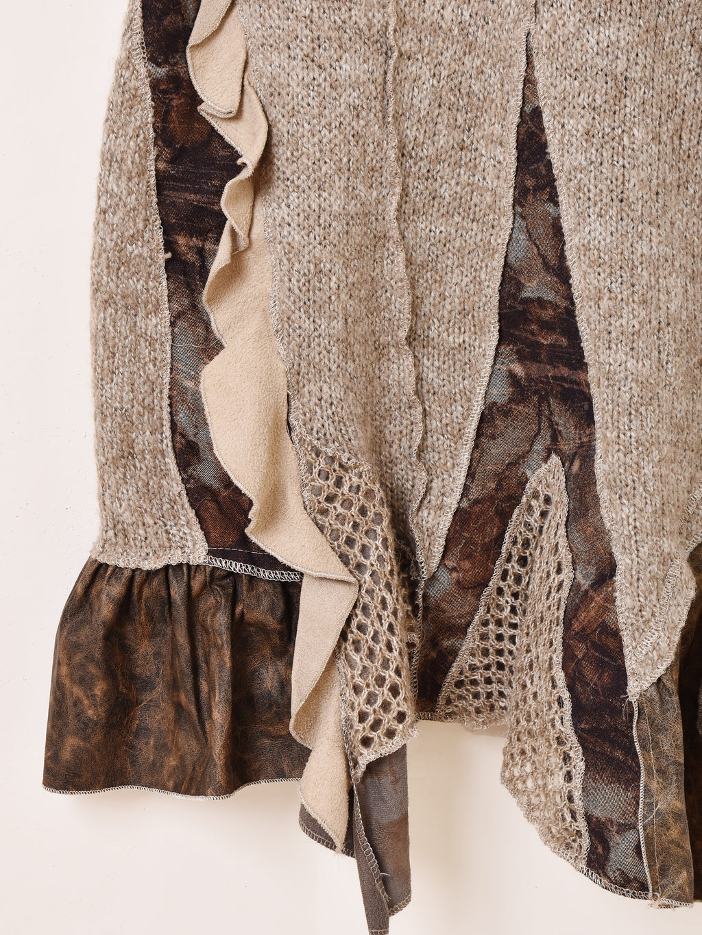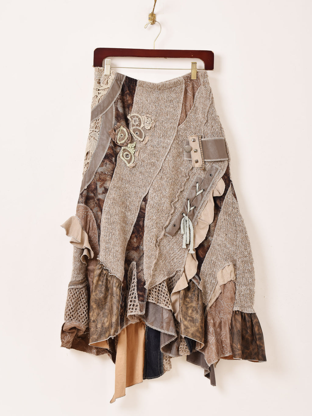 レースやレザーパッチ、刺繍などおしゃれなデザインのニットスカート。異なる生地で仕立てたフリルもポイント。程よいミディ丈で、ブーツとの組み合わせがおすすめです。