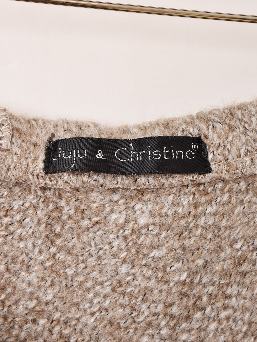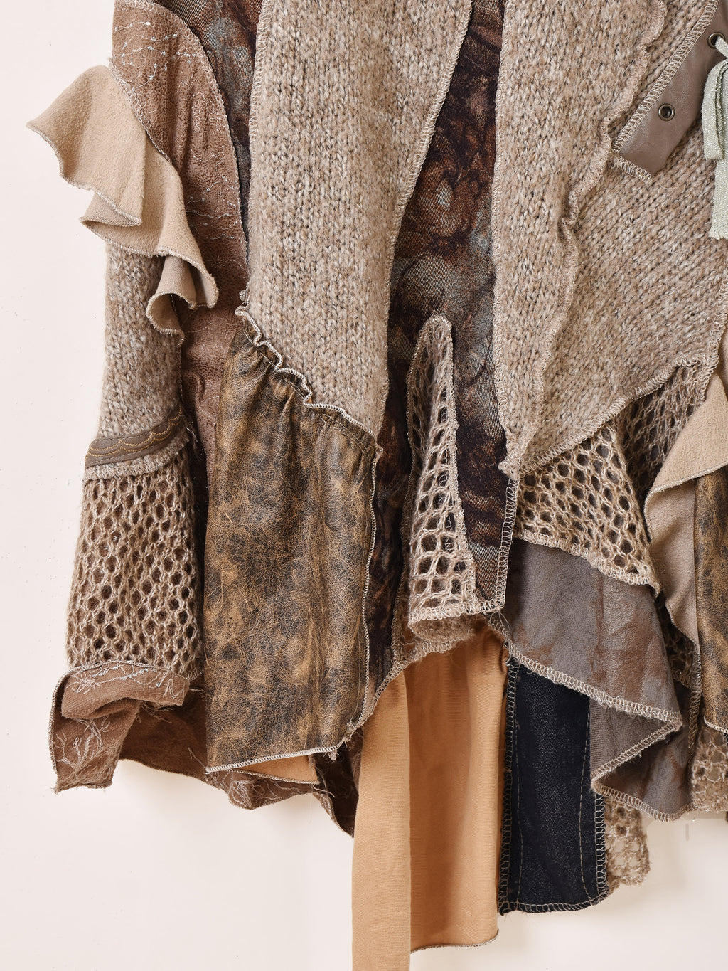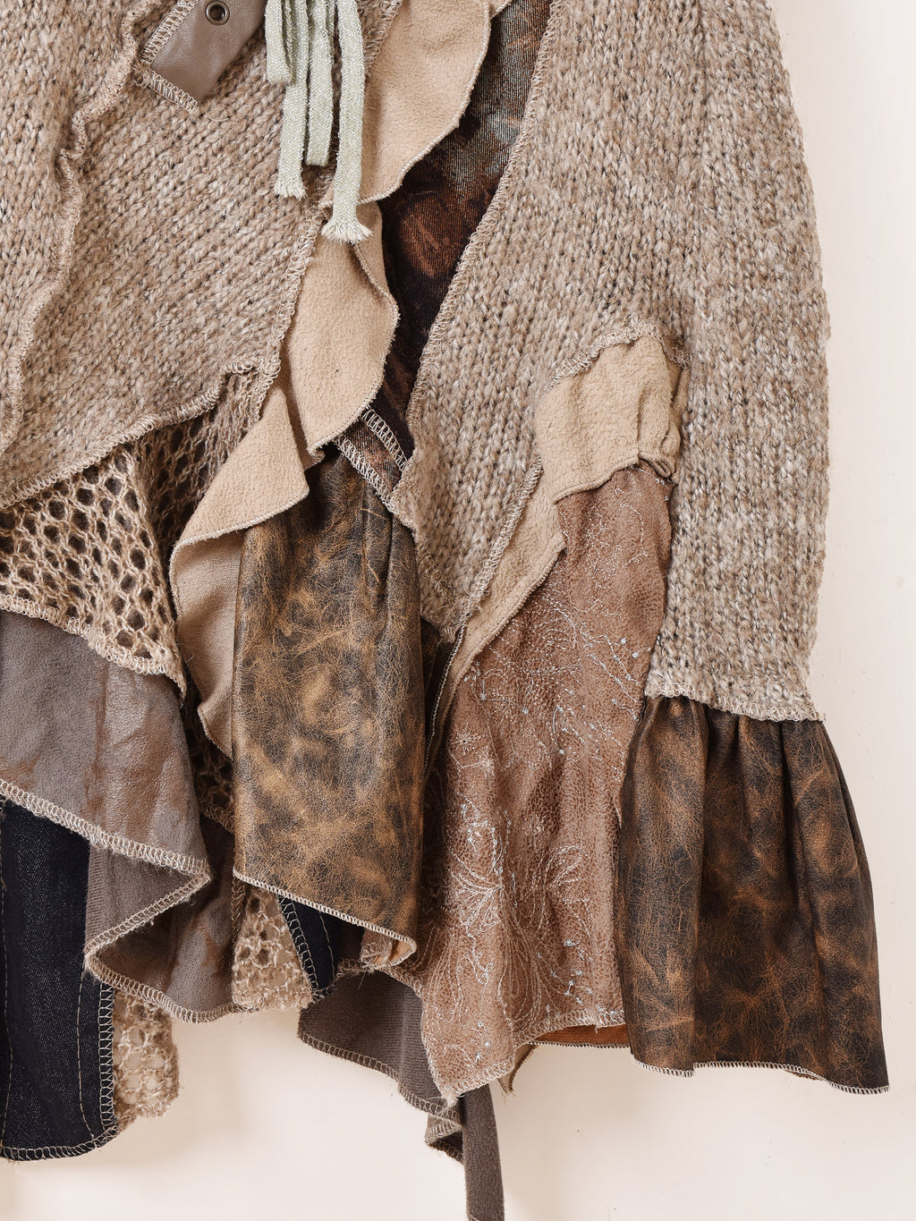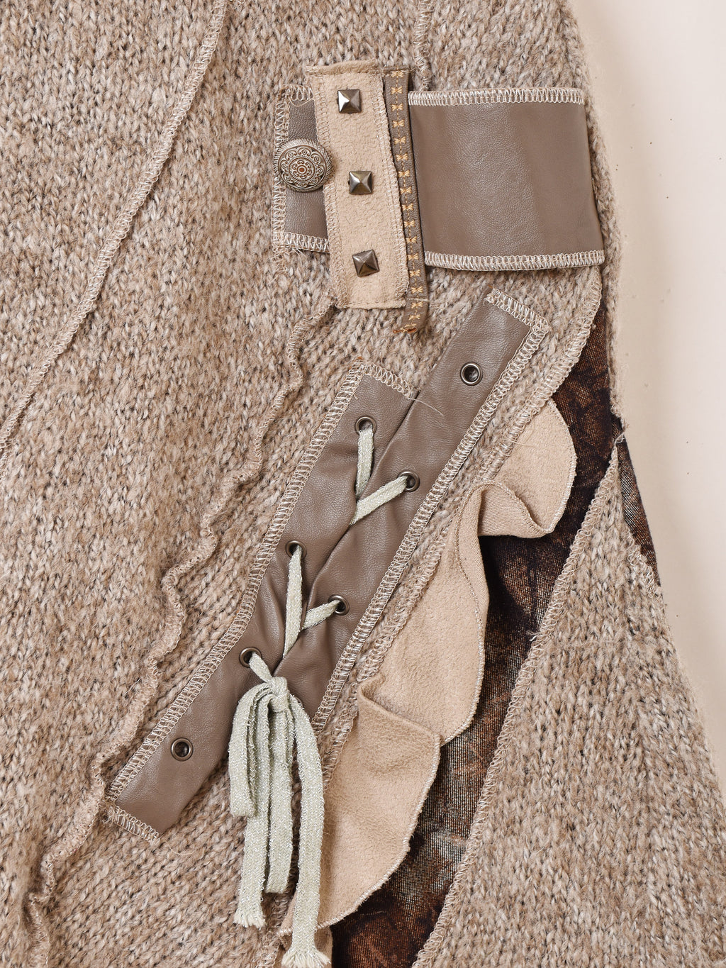レースやレザーパッチ、刺繍などおしゃれなデザインのニットスカート。異なる生地で仕立てたフリルもポイント。程よいミディ丈で、ブーツとの組み合わせがおすすめです。