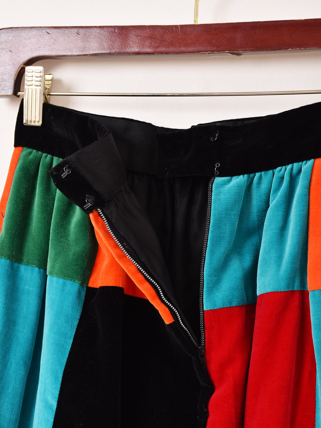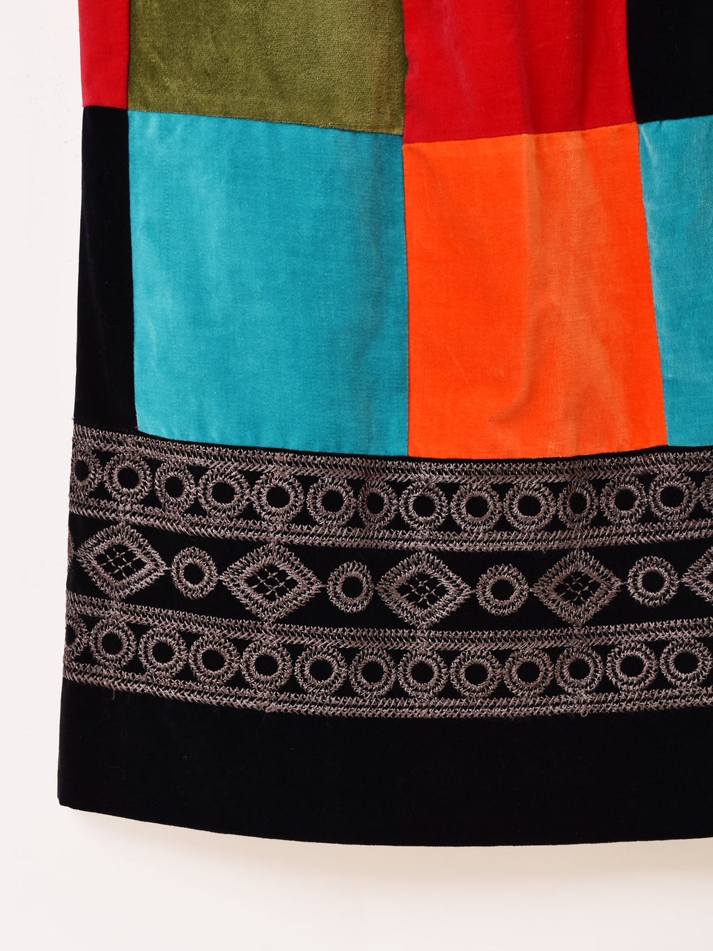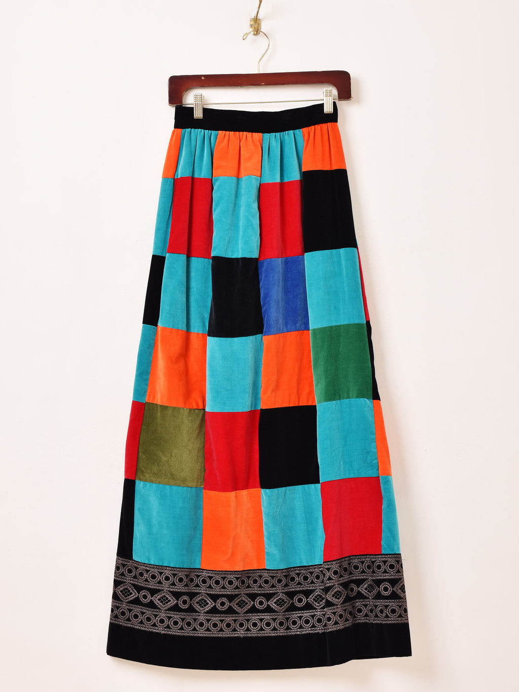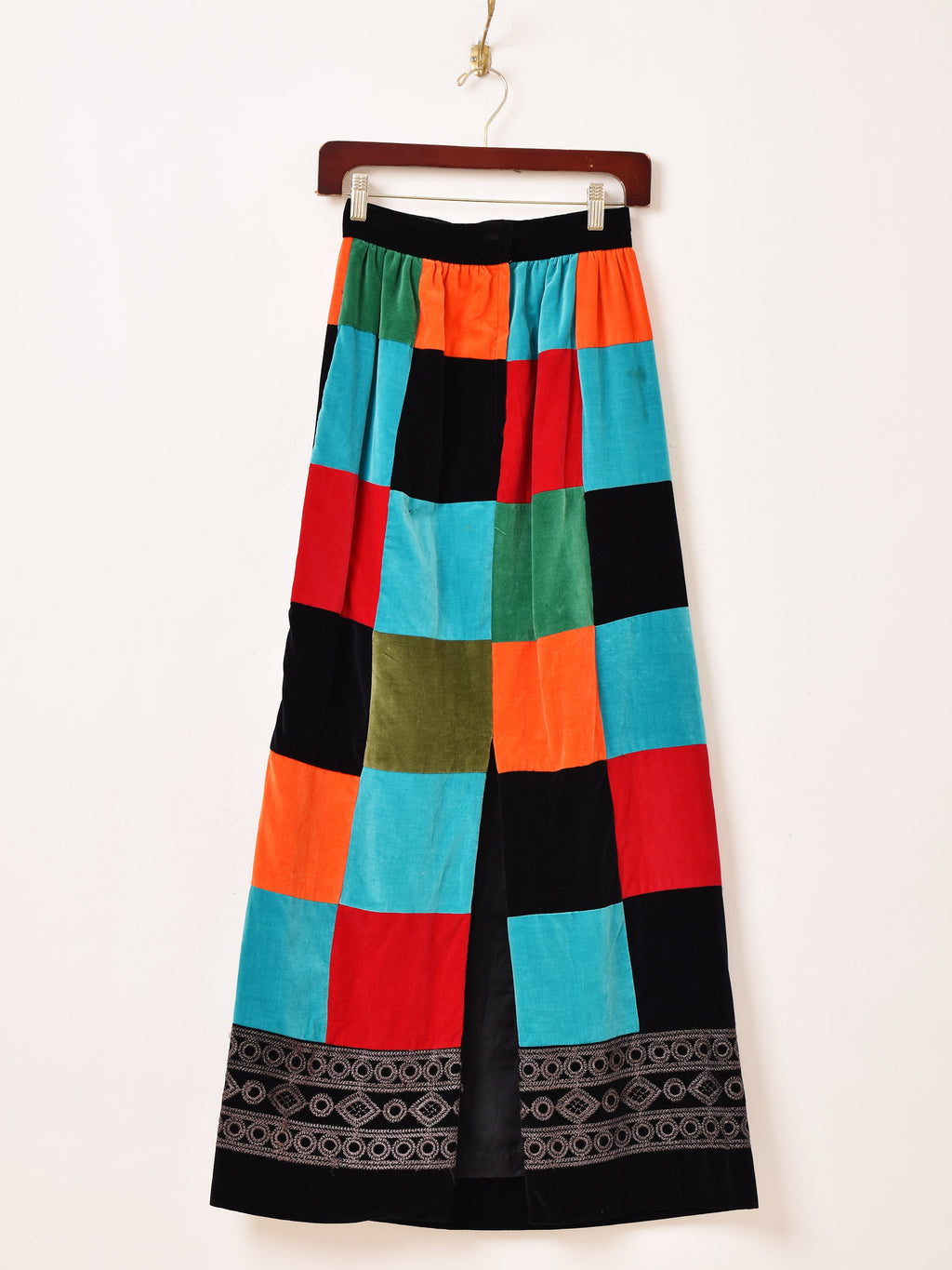 カラフルなパッチワークが目を惹くマキシスカート。裾にあしらった刺繍にベロアの重厚感がアンティークな雰囲気があります。古着らしい魅力がたっぷりの一着です。