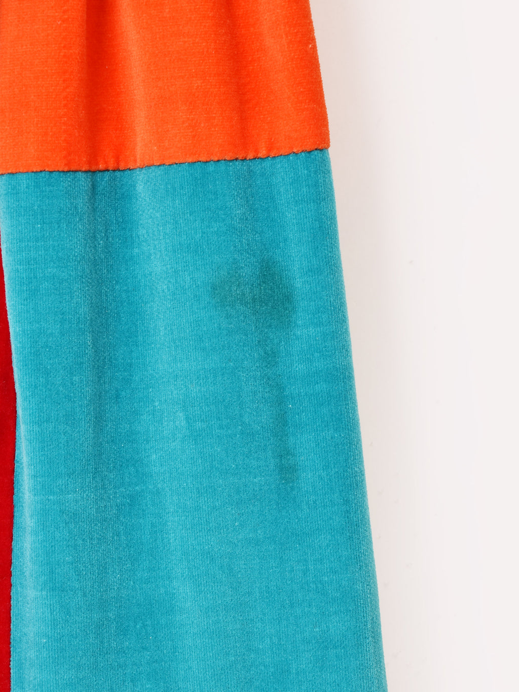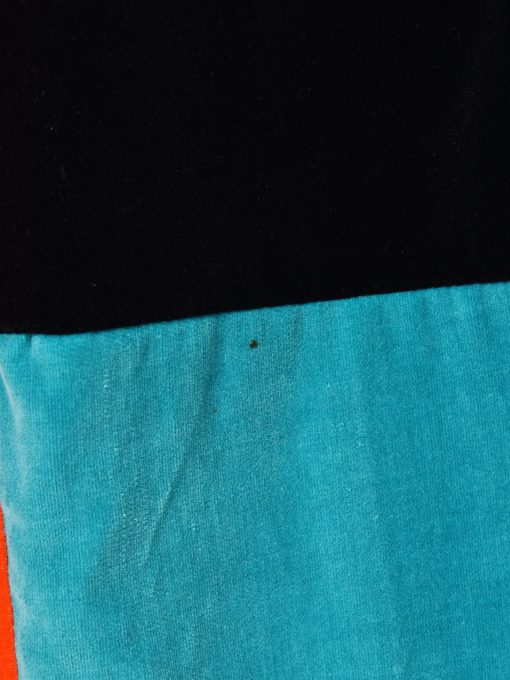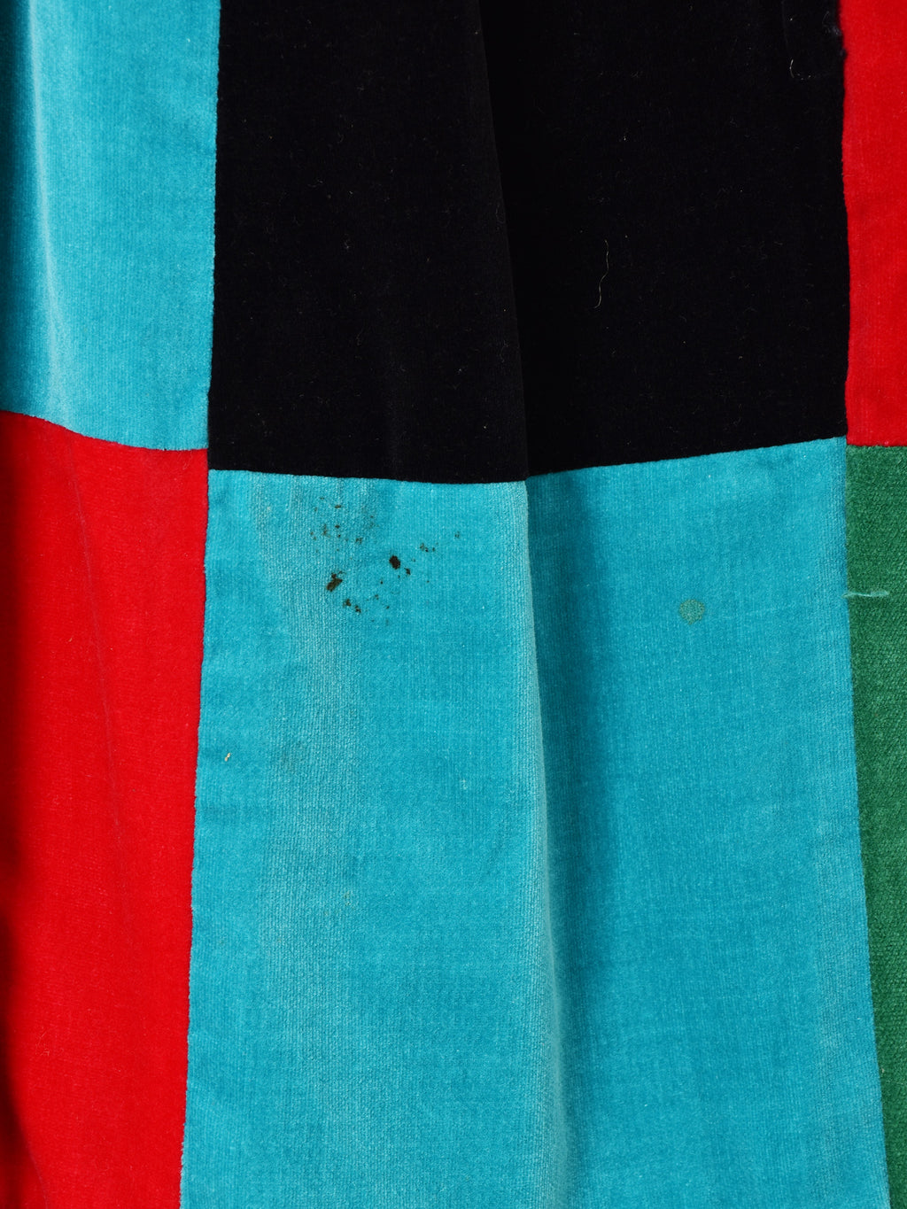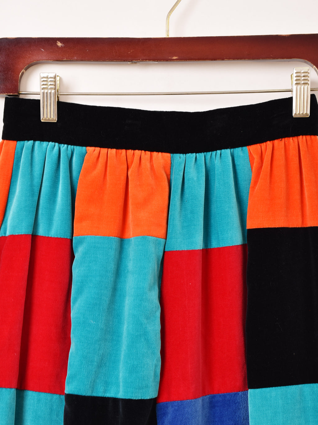 カラフルなパッチワークが目を惹くマキシスカート。裾にあしらった刺繍にベロアの重厚感がアンティークな雰囲気があります。古着らしい魅力がたっぷりの一着です。