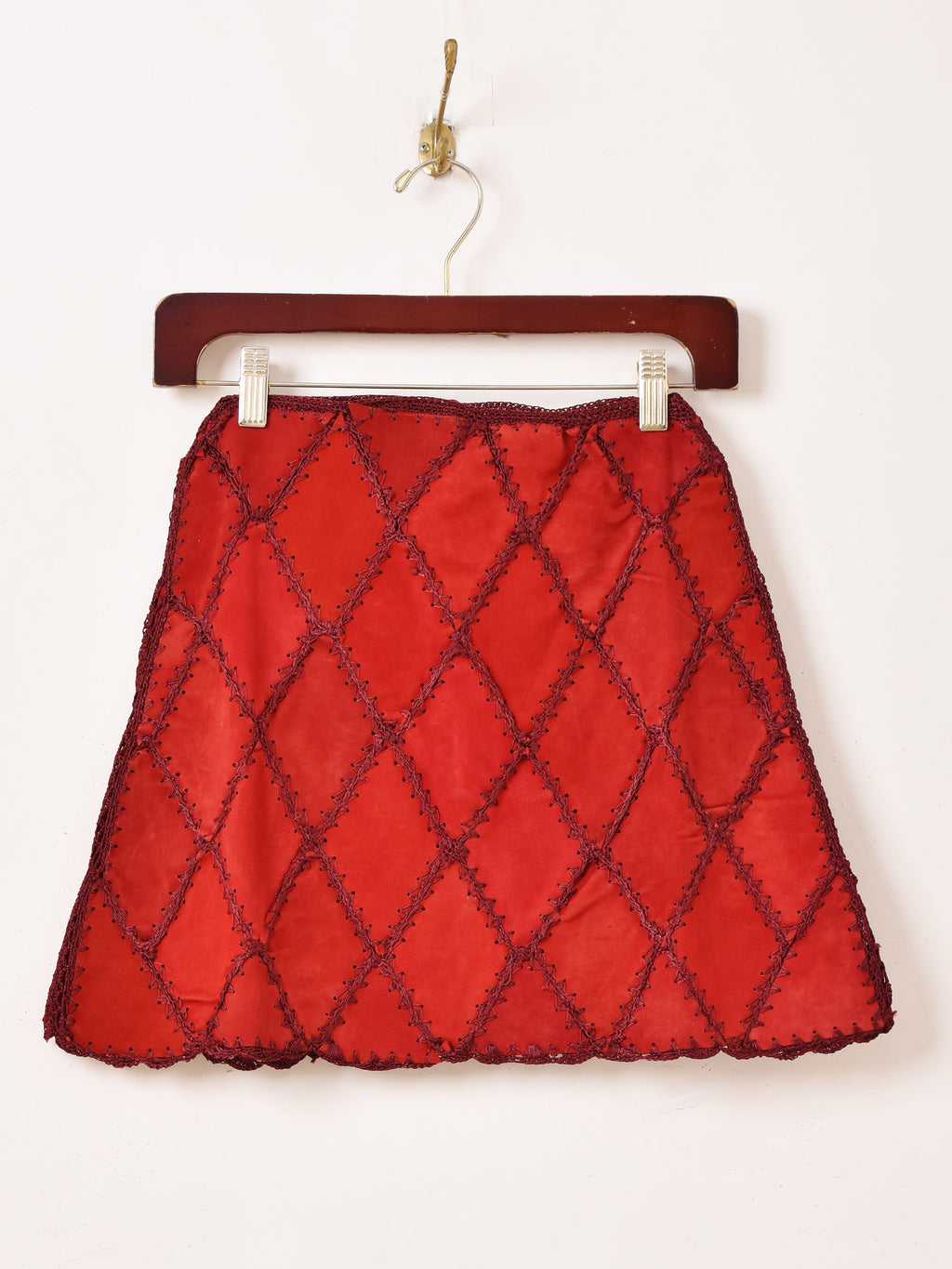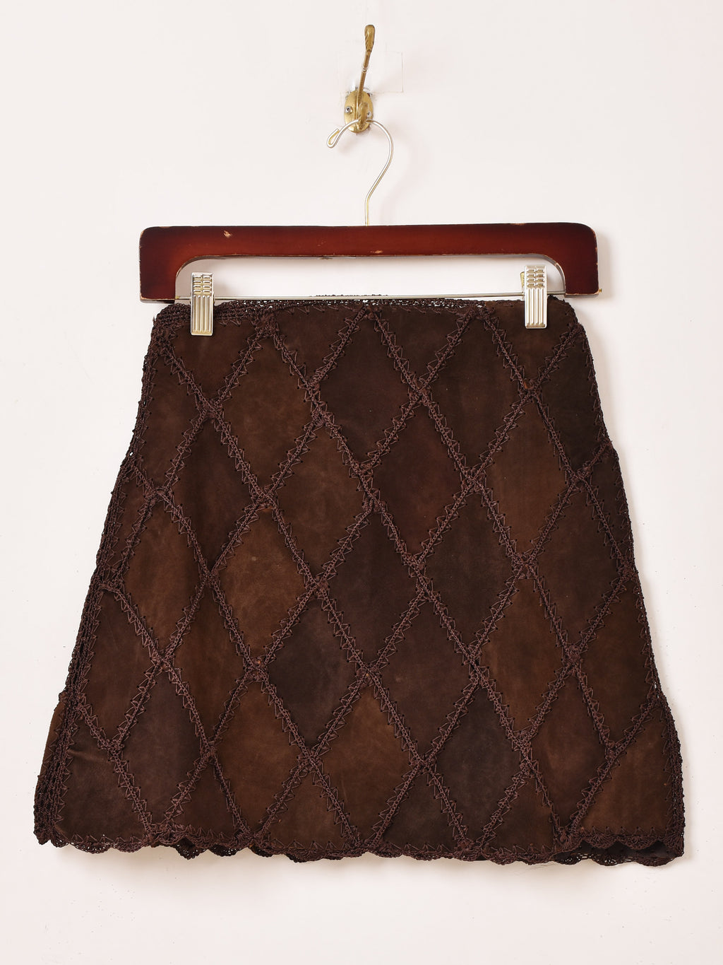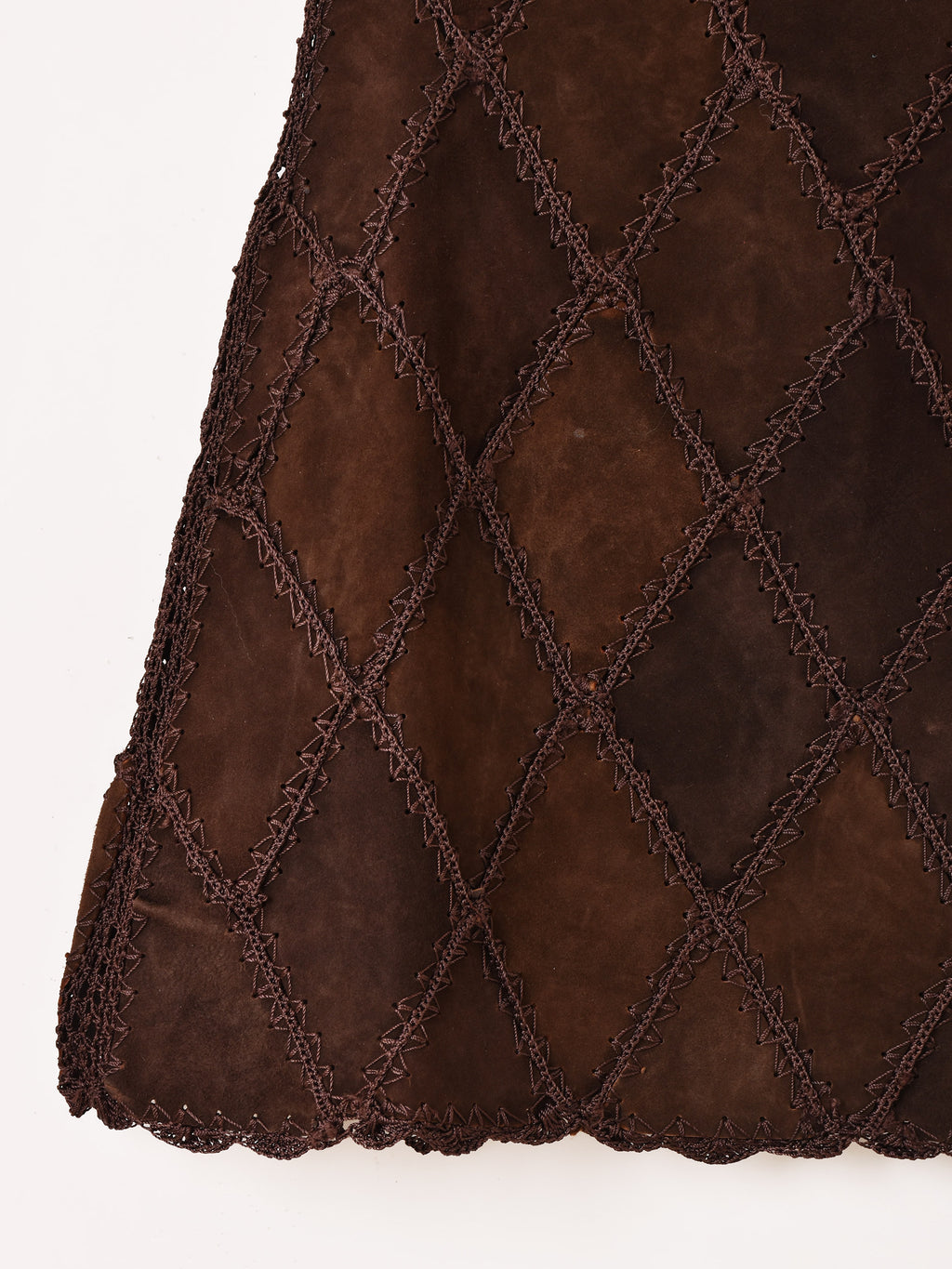 ダイヤ型にパッチワークされたデザインのスエードミニスカ。他のボトムスと組み合わせて、秋冬のレイヤードファッションのちょっとしたアクセントにおすすめの一着です。