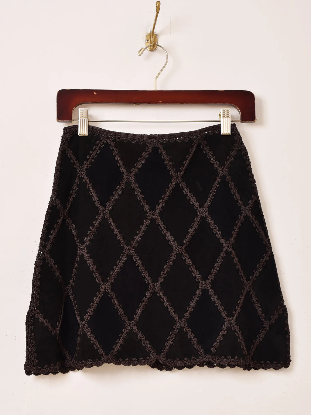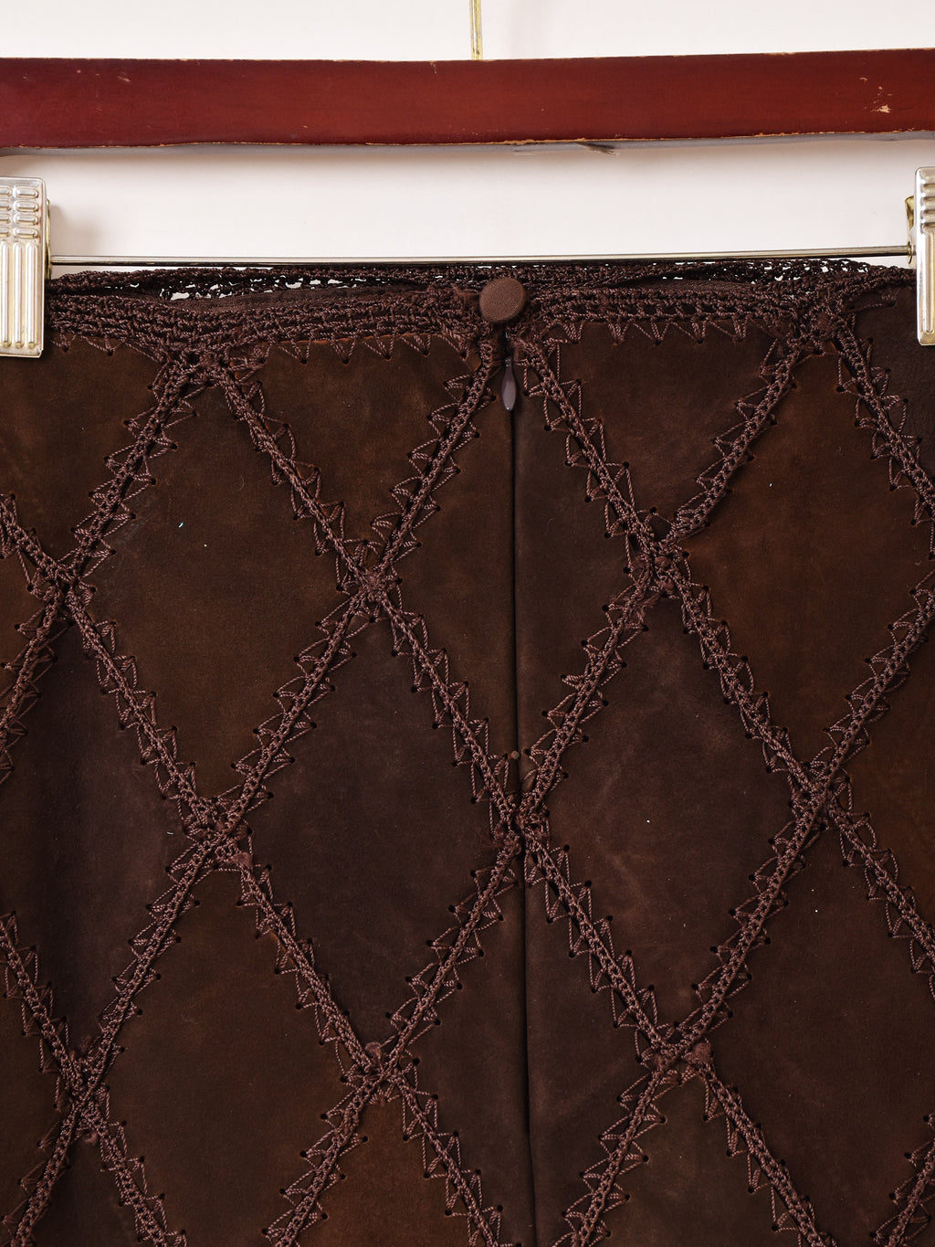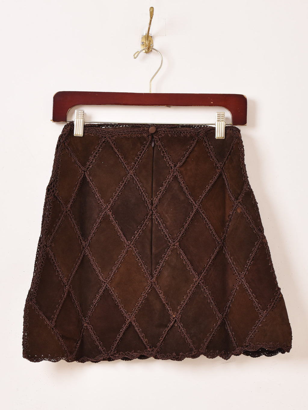 ダイヤ型にパッチワークされたデザインのスエードミニスカ。他のボトムスと組み合わせて、秋冬のレイヤードファッションのちょっとしたアクセントにおすすめの一着です。