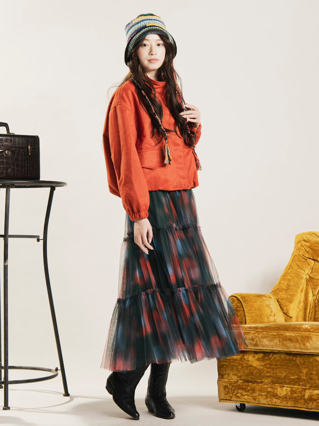 神秘的なグラデーション風のカラーが目を惹くロングスカート。チュールの程よい透け感と、ふんわりと動きのあるシルエットのティアードデザインが魅力的な一着。裏地付きで、季節を問わず着こなせます。