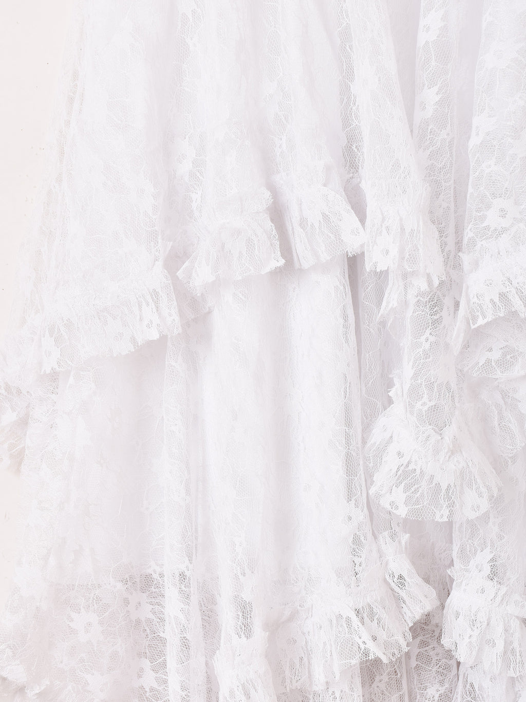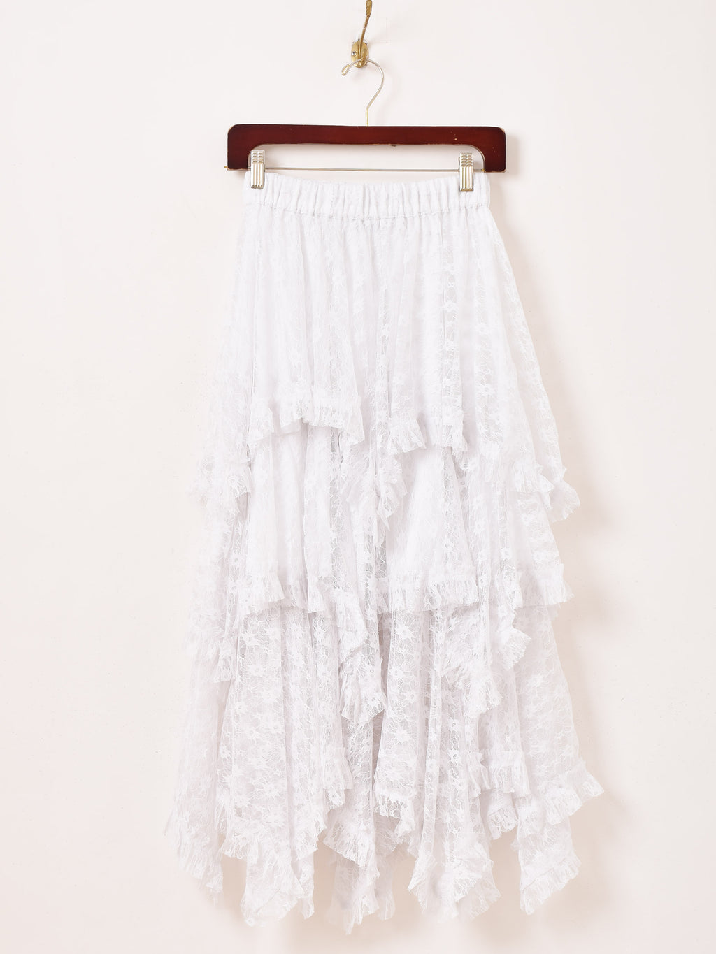 ランダムデザインが可愛いレースのロングスカート。3段重ねのラッフル構造で、動きのあるシルエットがポイント。裏地は膝下まであり、足元はレースの透け感で綺麗に見せてくれます。他のボトムスとも組み合わせて、レイヤードコーデにも着回せます。