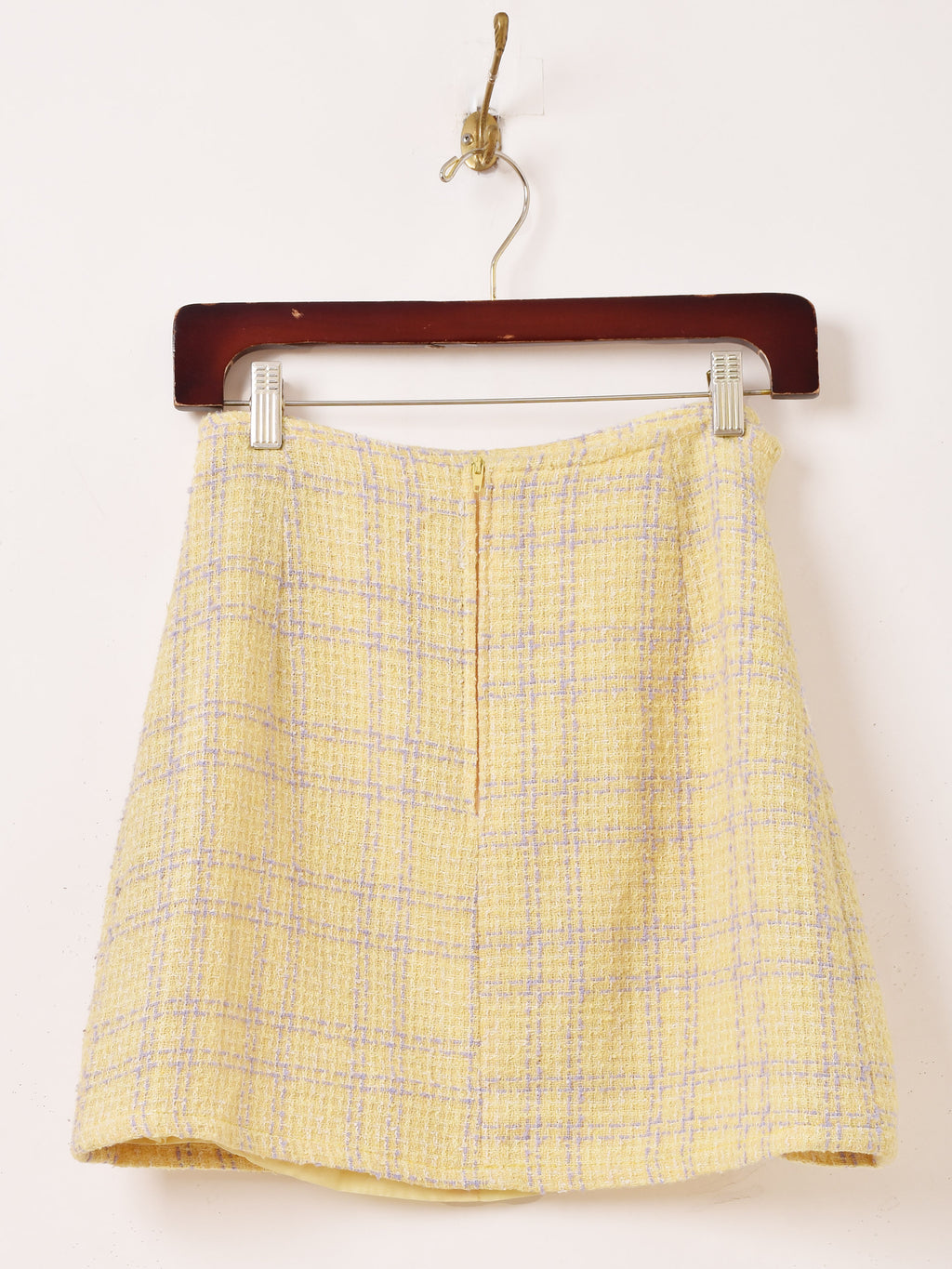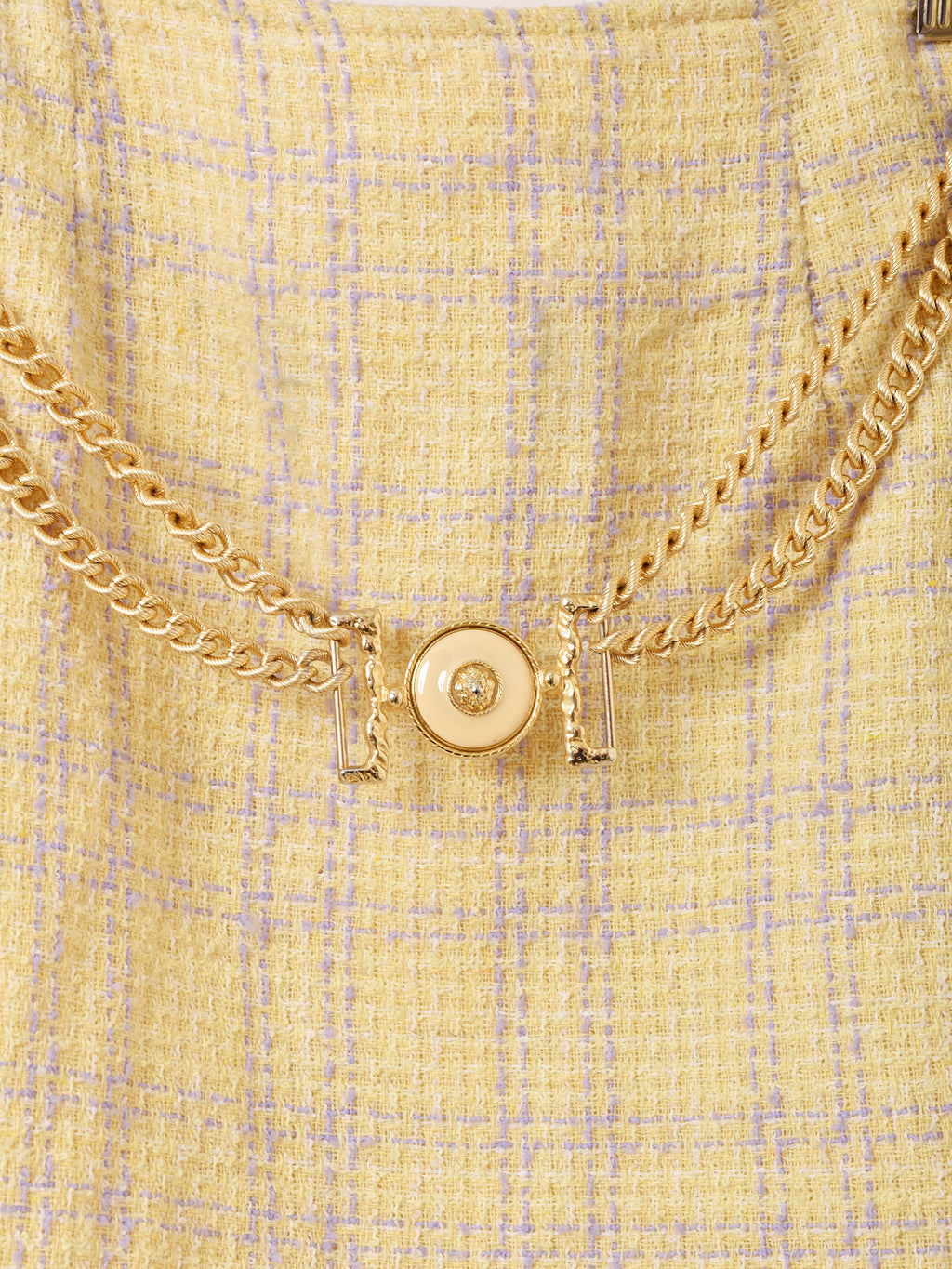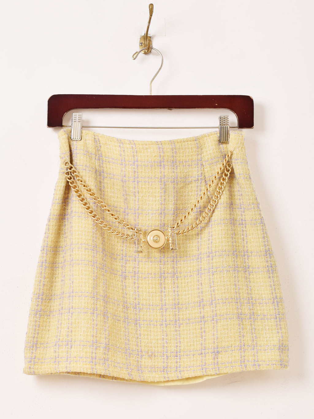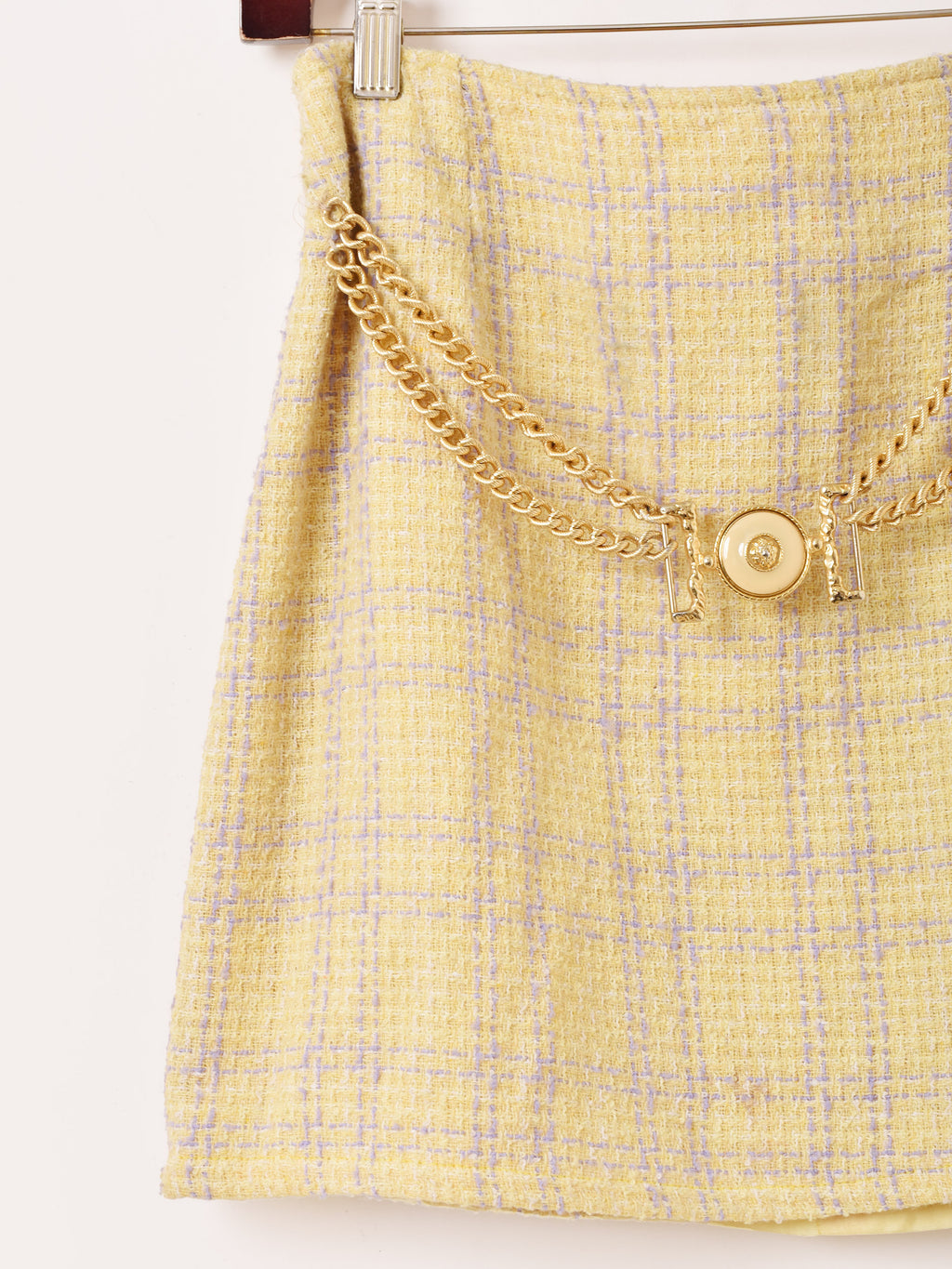 淡いイエローカラーに、ゴージャスなチェーン装飾が付いたミニスカ。Y2Kファッションにおすすめの一着です。