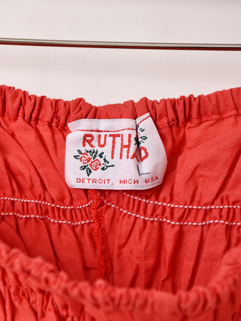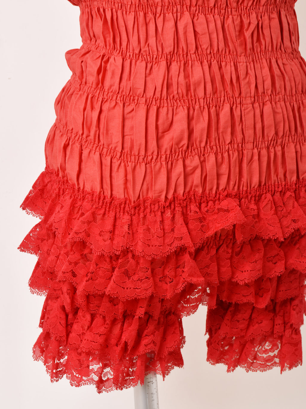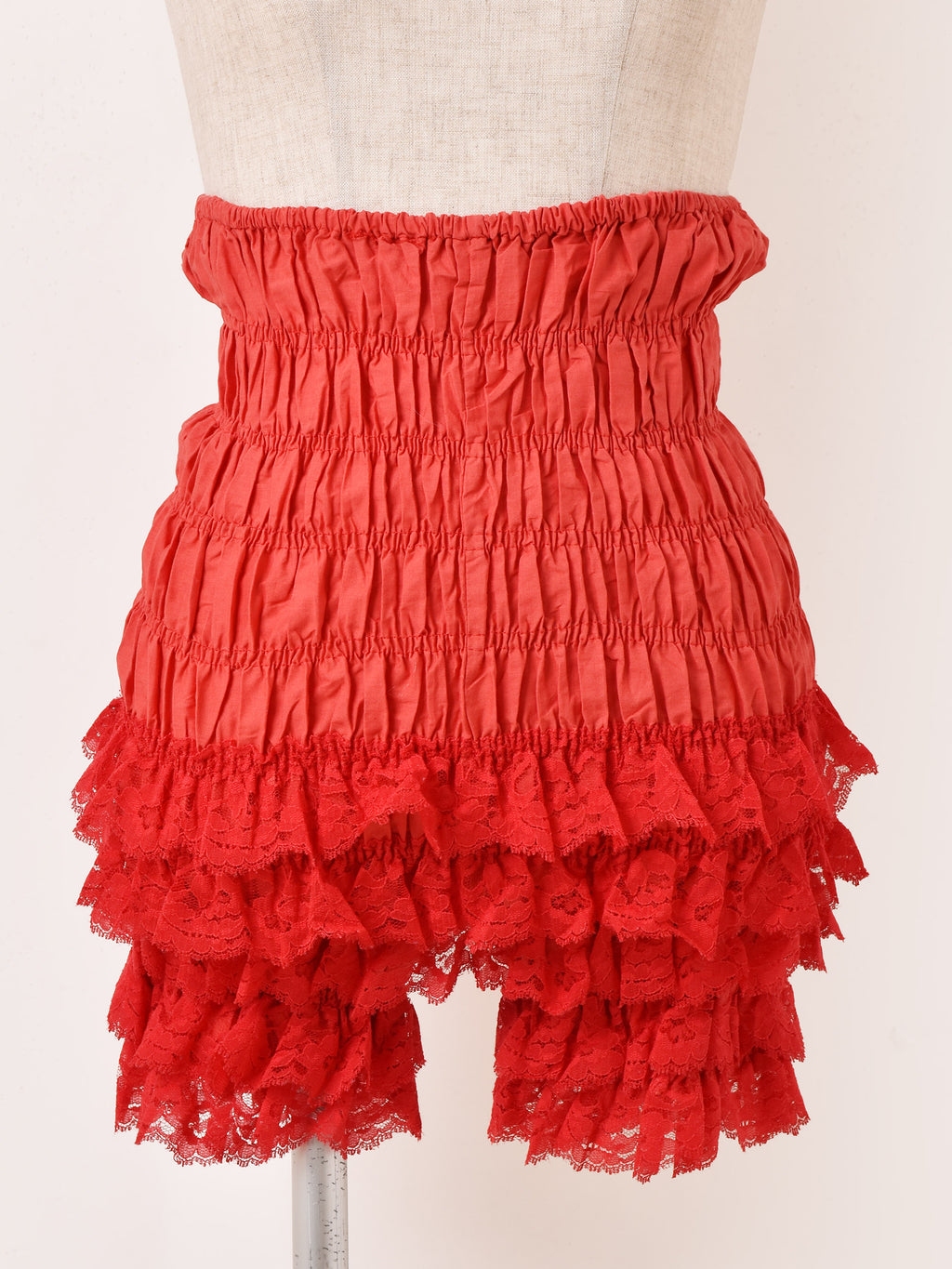 レースのラッフルデザインになったオーバーパンツ。ウエストはワイドギャザー仕様で着脱が楽ちんです。スカートの下に履くペチパンツとしても、コーディネートのアクセントに、単体でショートパンツとしても着用いただけます。