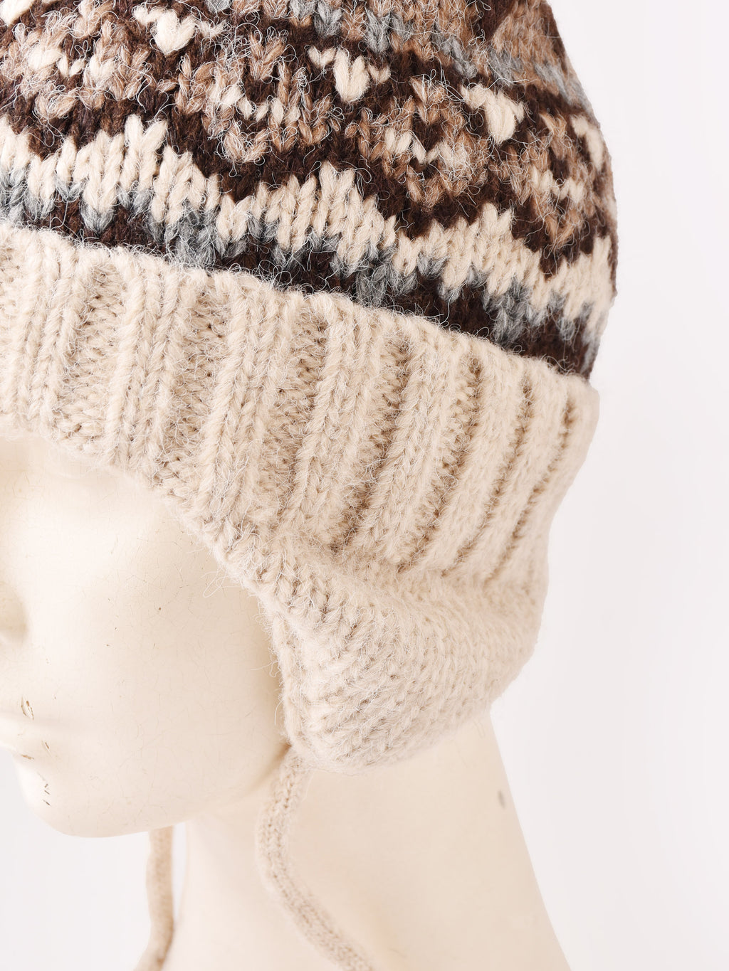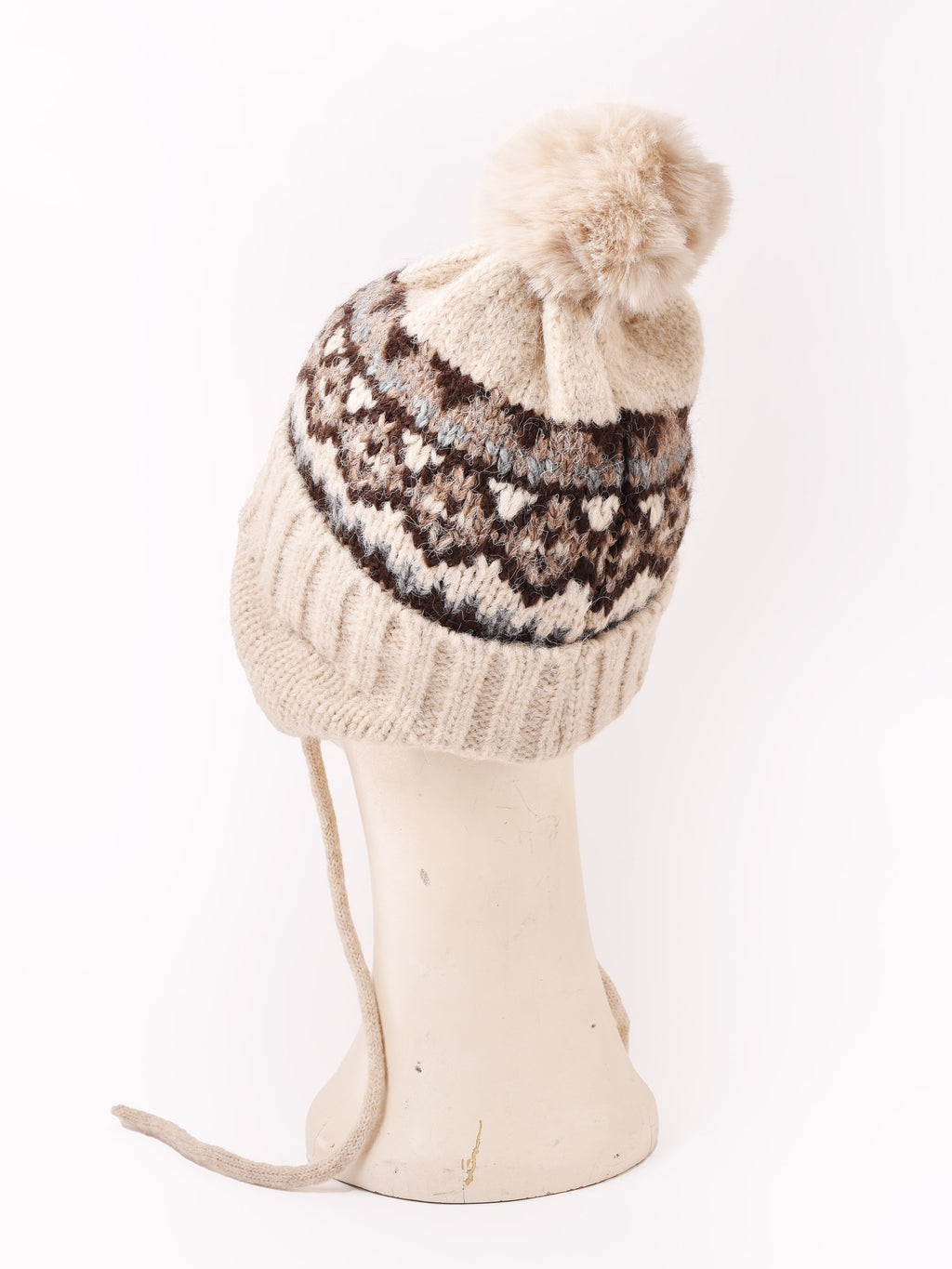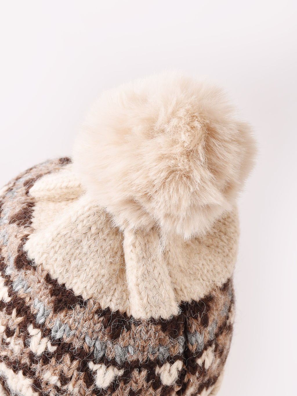 秋冬らしさを感じるノルディック調デザインに、ポンポンがアクセントになったニットキャップ。ほっこりとあたたかみのある生地感が、耳元まで防寒対策バッチリの一点です。
