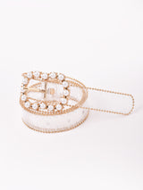 バックルにパールがあしらわれたクリアベルト。帯はゴールドチェーンで囲われています。Y2Kファッションなどの旬なコーデにぴったりです。