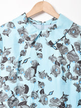 爽やかなサックスブルーが魅力の総柄ワンピース。裏地付きで安心感のある一着。おそらくポリエステル生地です。