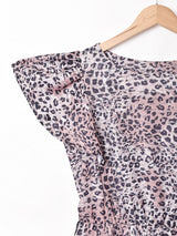 フリルスリーブが優しさのスパイスを加える半袖ワンピース。おそらくポリエステル素材の、軽やかな一着です。
