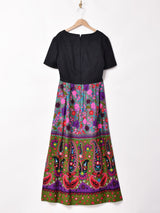 70's風デザインが魅力の半袖ワンピース。おそらくポリエステル素材で、少し光沢のある不思議な生地感です。