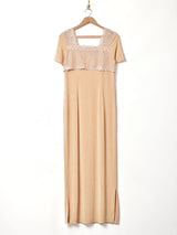上品なレースと伸縮性のあるライクラ生地がヌーディにマッチした半袖ワンピース。光沢感のある生地もポイントです。