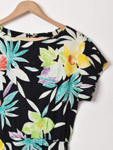 南国気分の大きな花柄が気分をあげてくれる半袖ワンピース。おそらくコットン素材で、ハリ感のある一着です。