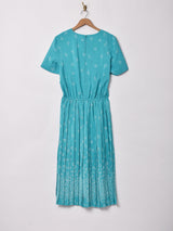 手描き風のラフに描かれた模様が印象的なワンピース。ウエストゴム仕様で、スカート部分はプリーツ加工で動く度に揺れるデザイン。さらっとしたポリエステルらしい生地感です。