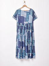 パッチワーク風の総柄が雰囲気のよいワンピース。おそらくリネン×コットン素材で、やや透け感のある薄手の生地が涼し気な一枚。ウエストの細かなギャザーがふんわりとボリューミーなシルエットを作ります。