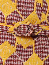品と個性を兼ね備えたレトロな総柄ワンピース。同布のベルト付きで、スカートのフレアシルエットが際立つデザインがポイント。おそらくポリエステル素材で、ふっくらと厚みのある柔らかな生地です。