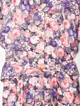 エレガントな花柄が魅力の半袖ワンピ—ス。ガウン感覚で羽織れるフロントオープンタイプで、同布のリボンベルト付き。薄手の柔らかなレーヨン生地です。