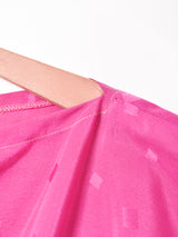 ビビッドピンクをベースにした大胆な模様が目を惹くワンピース。光沢のあるダイヤの織柄が魅力的。おそらくポリエステル素材の軽やかな薄手の生地で、裏地はありません。