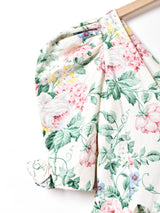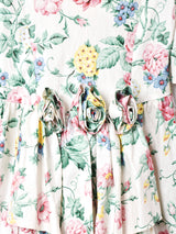 カラフルな花柄とロマンチックなディテールがマッチしたワンピース。ボリューミーなシルエットがチャーミング。おそらくコットン素材で、ややハリのある生地感です。