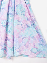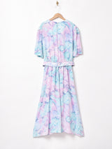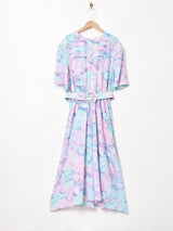 水彩画のような華やかな模様と色味が印象的な半袖ワンピース。同布のベルト付きで、軽やかに揺れるフレアスカートが魅力。薄手のつるんとした生地です。