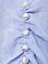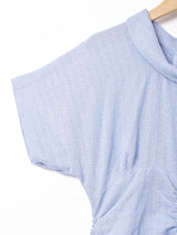 ウエストの個性的なデザインが魅力の半袖ワンピース。くすみブルーがよい雰囲気。おそらくレーヨン素材で、薄手のさっぱりとした生地感です。
