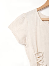 サイドのレースアップでフィット&フレアシルエットを楽しめるワンピース。コットンリネンのボリュームがありながら爽やかな生地が特徴的で、フレンチスリーブやシェルボタンなど品のよい涼しげなディティールも魅力の一着です。