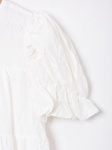 バックスタイルが可愛いティアードワンピース。全体にシワ加工を施し洒落た雰囲気をプラスし、パフスリーブは2枚仕立てにする事によってよりボリューム感を出しています。ホワイト、サックスブルー、ブラックの3色展開です。